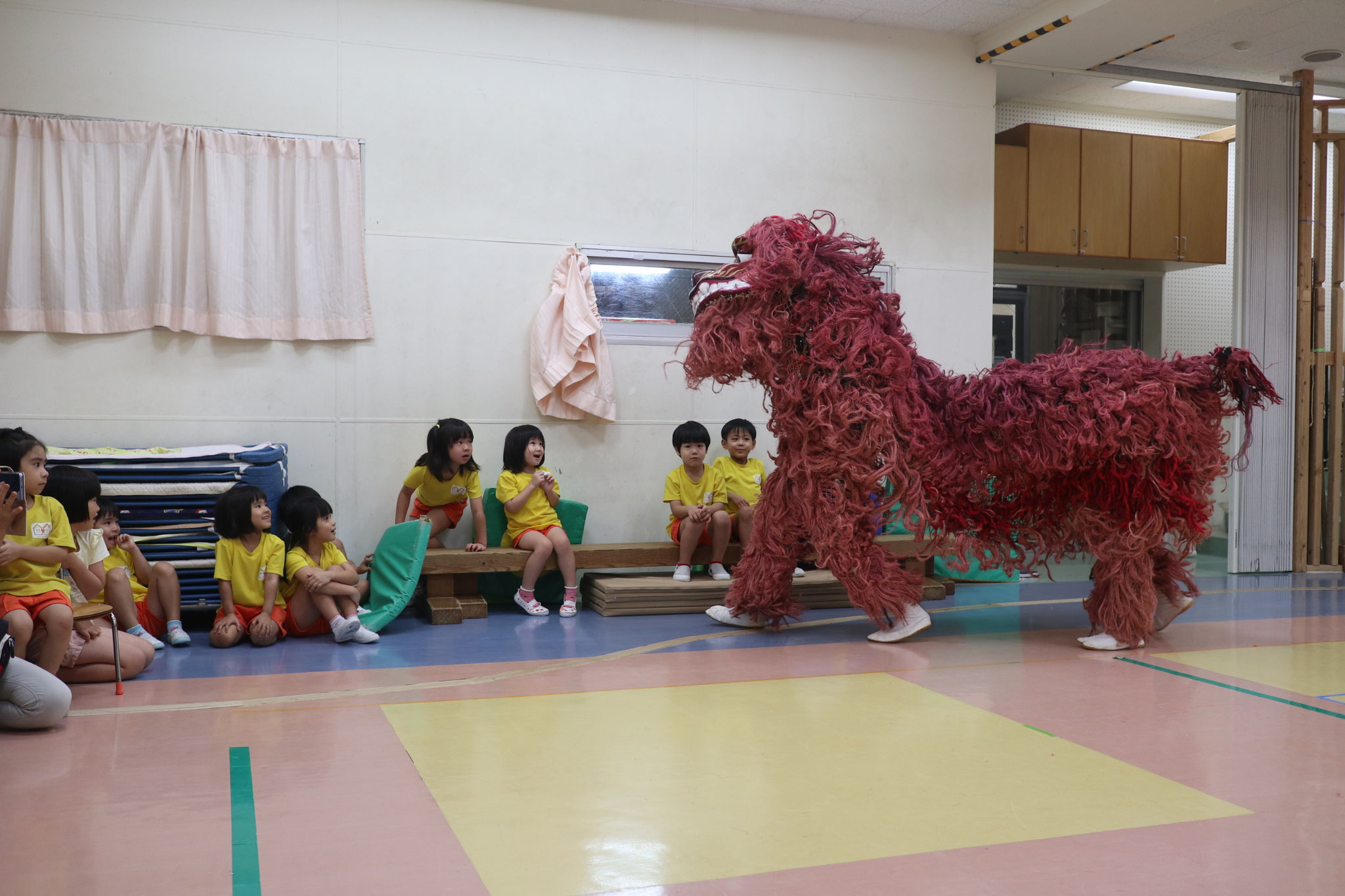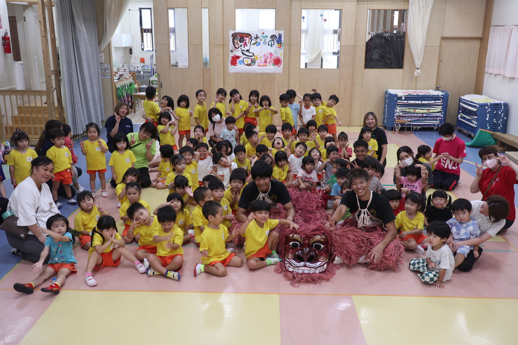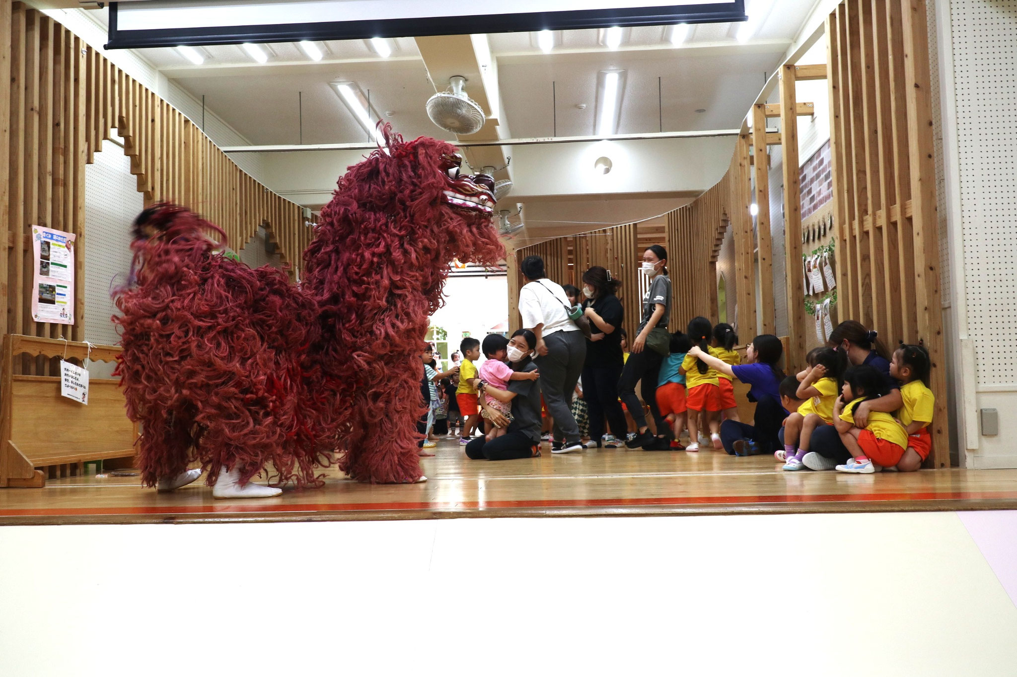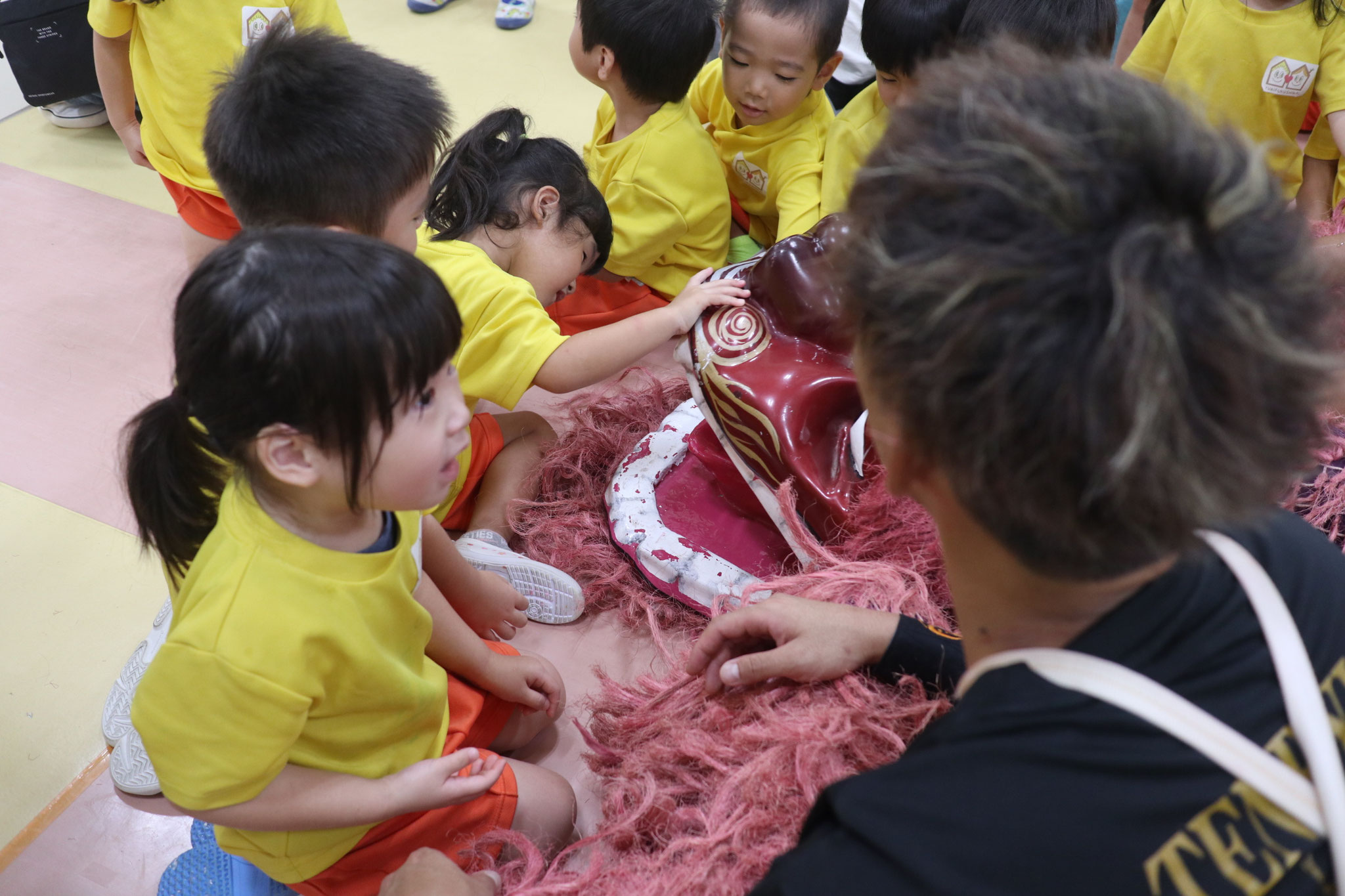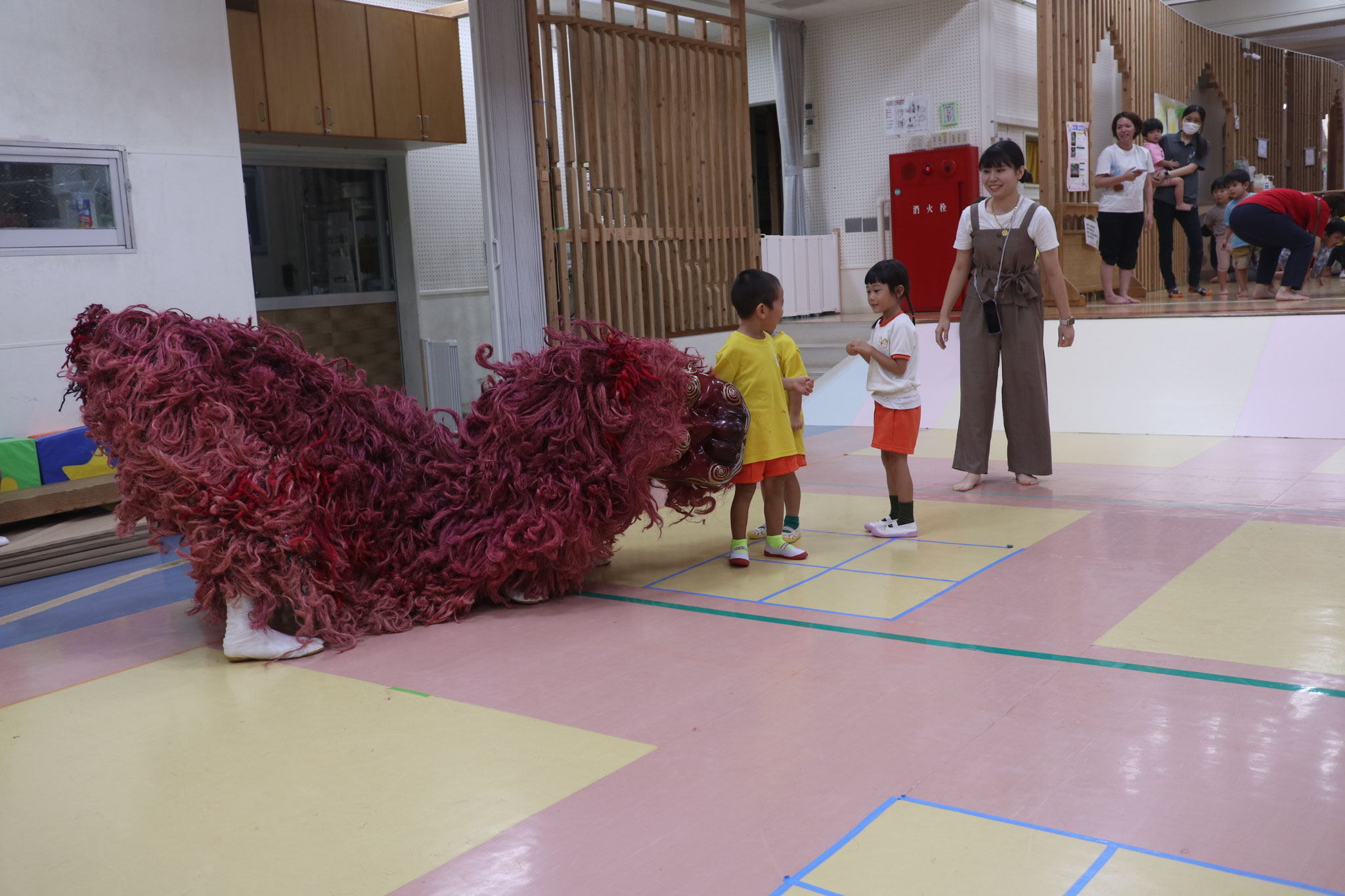 エイサーの次は、獅子舞がやってきました。それはそれは大きい獅子舞が現れると、思わず身構えてしまう子ども達もいれば、ワクワクする子ども達もいて反応は様々でした。百ぐみさんの中には、獅子舞に噛まれたいとリクエストする子もいて噛まれて満足げにしていました。