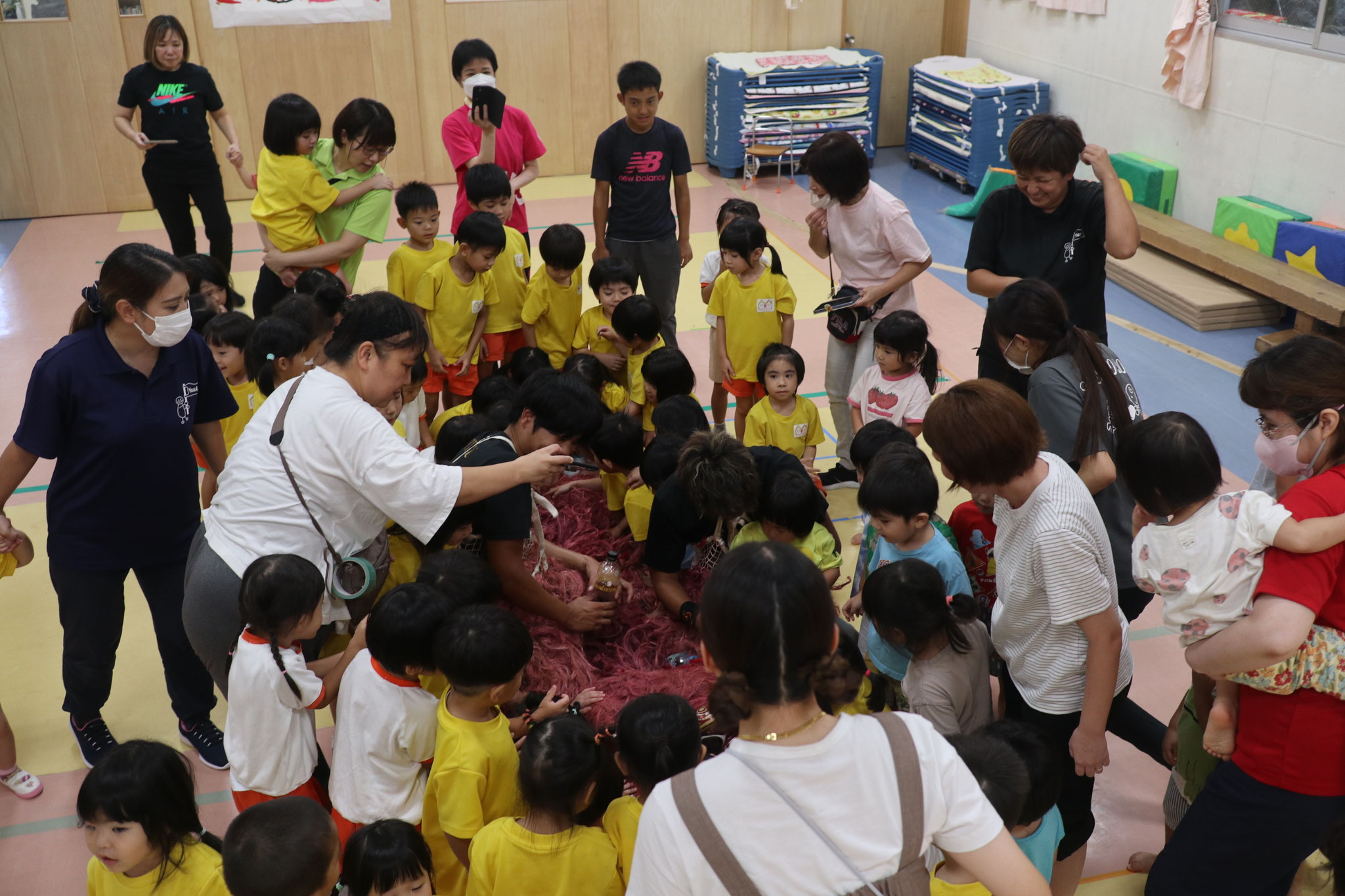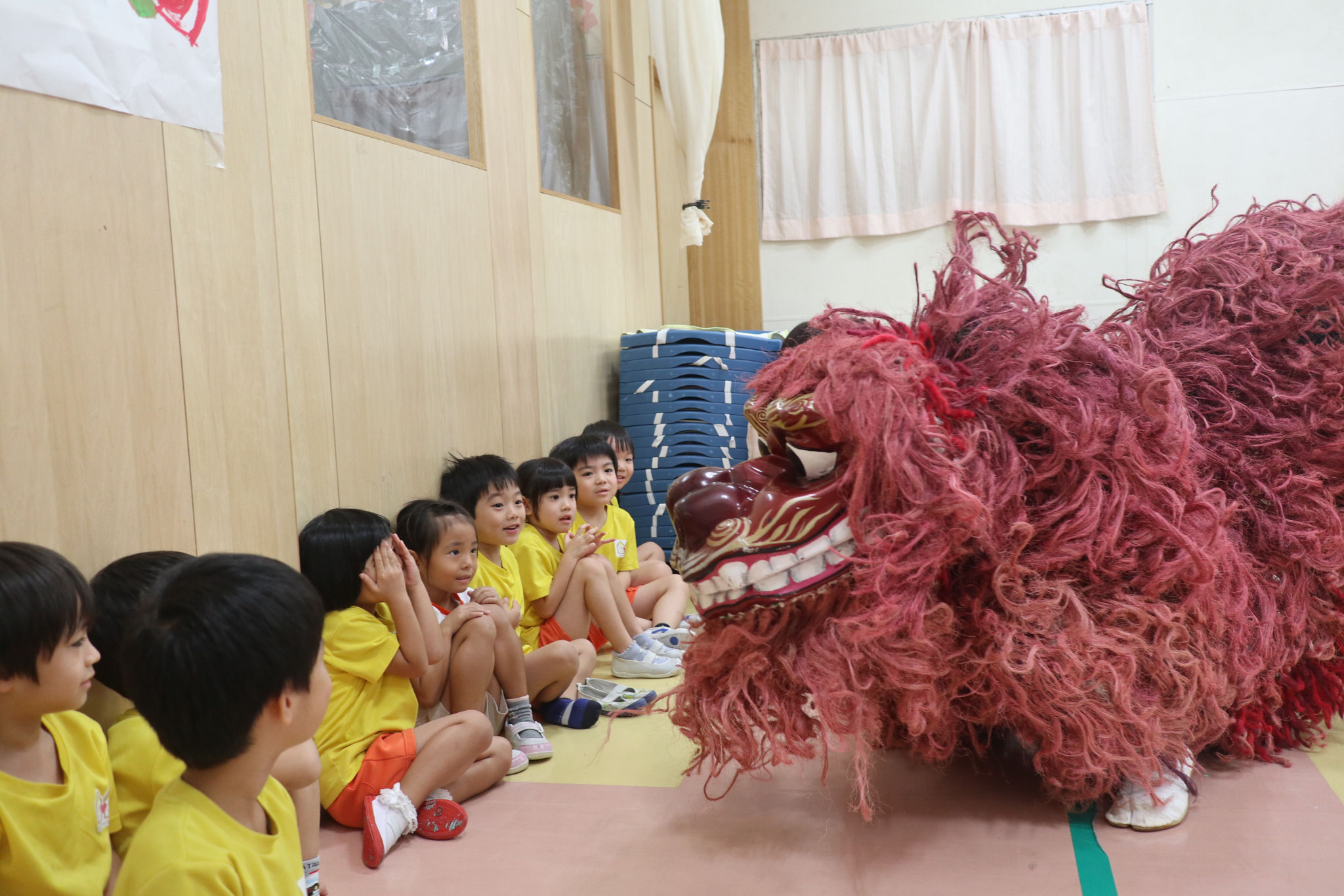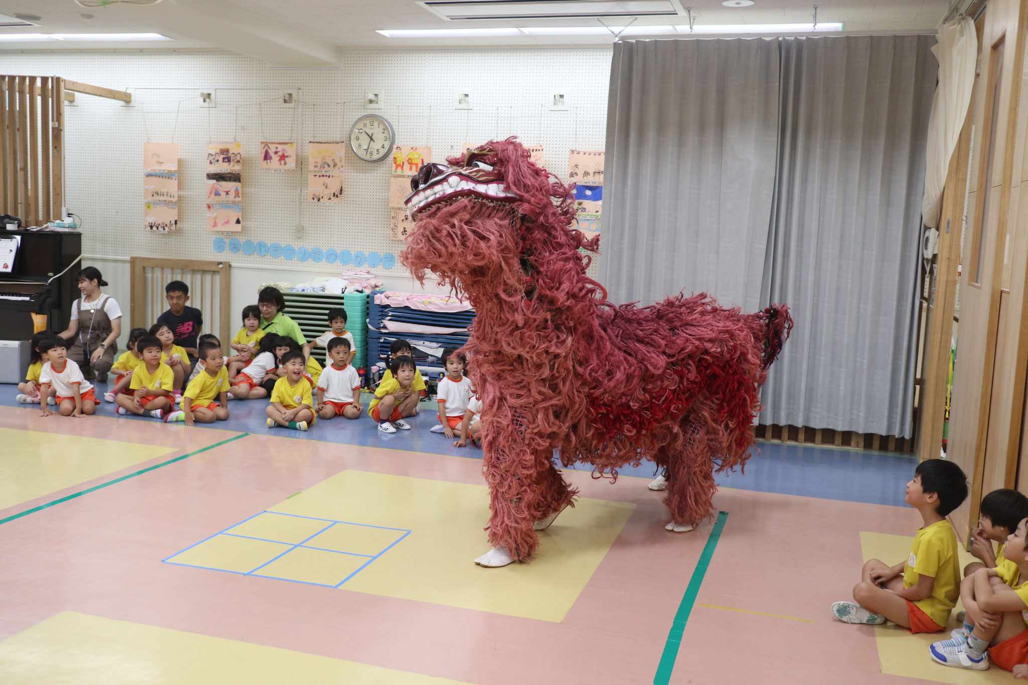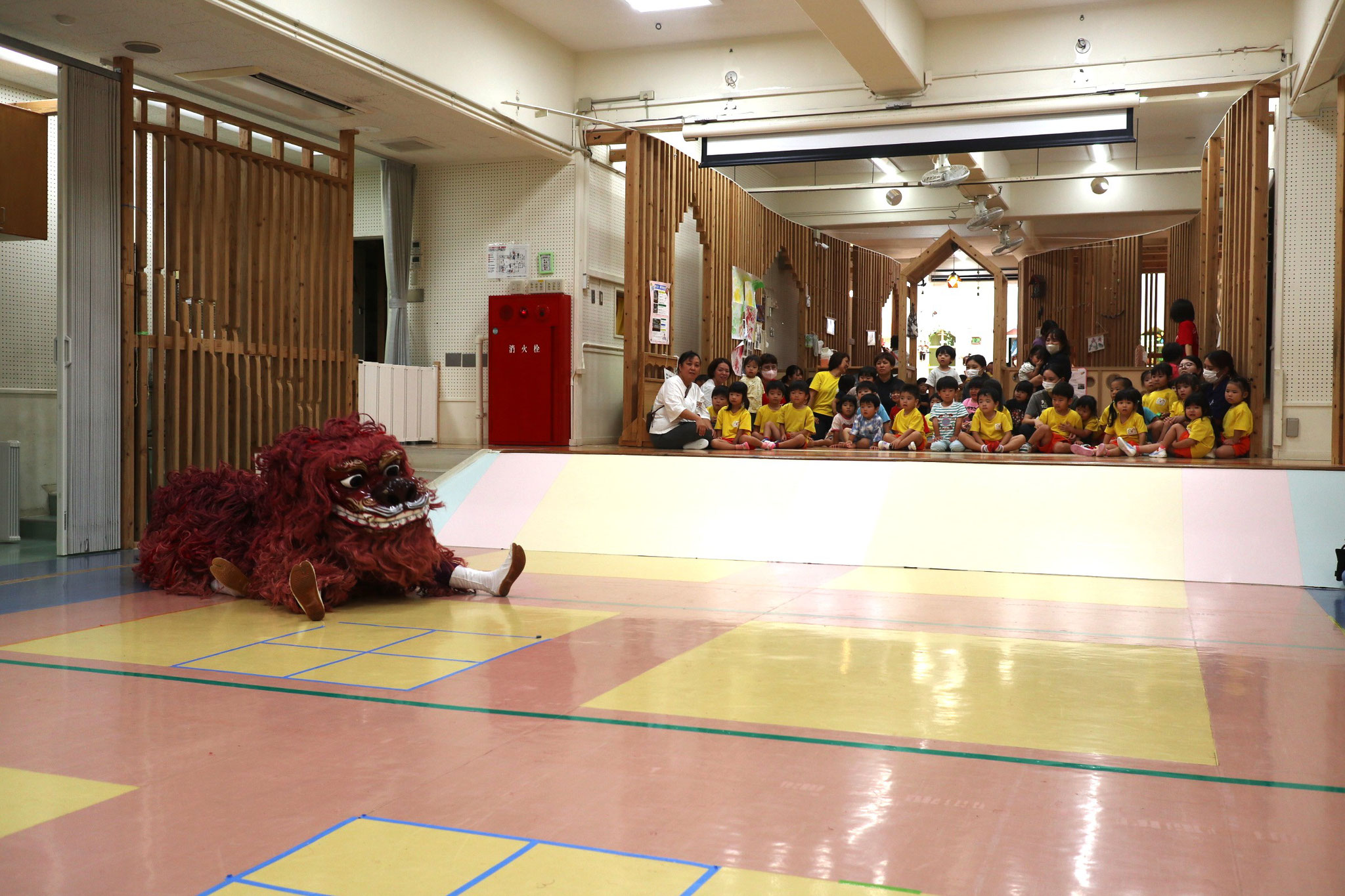 エイサーの次は、獅子舞がやってきました。それはそれは大きい獅子舞が現れると、思わず身構えてしまう子ども達もいれば、ワクワクする子ども達もいて反応は様々でした。百ぐみさんの中には、獅子舞に噛まれたいとリクエストする子もいて噛まれて満足げにしていました。