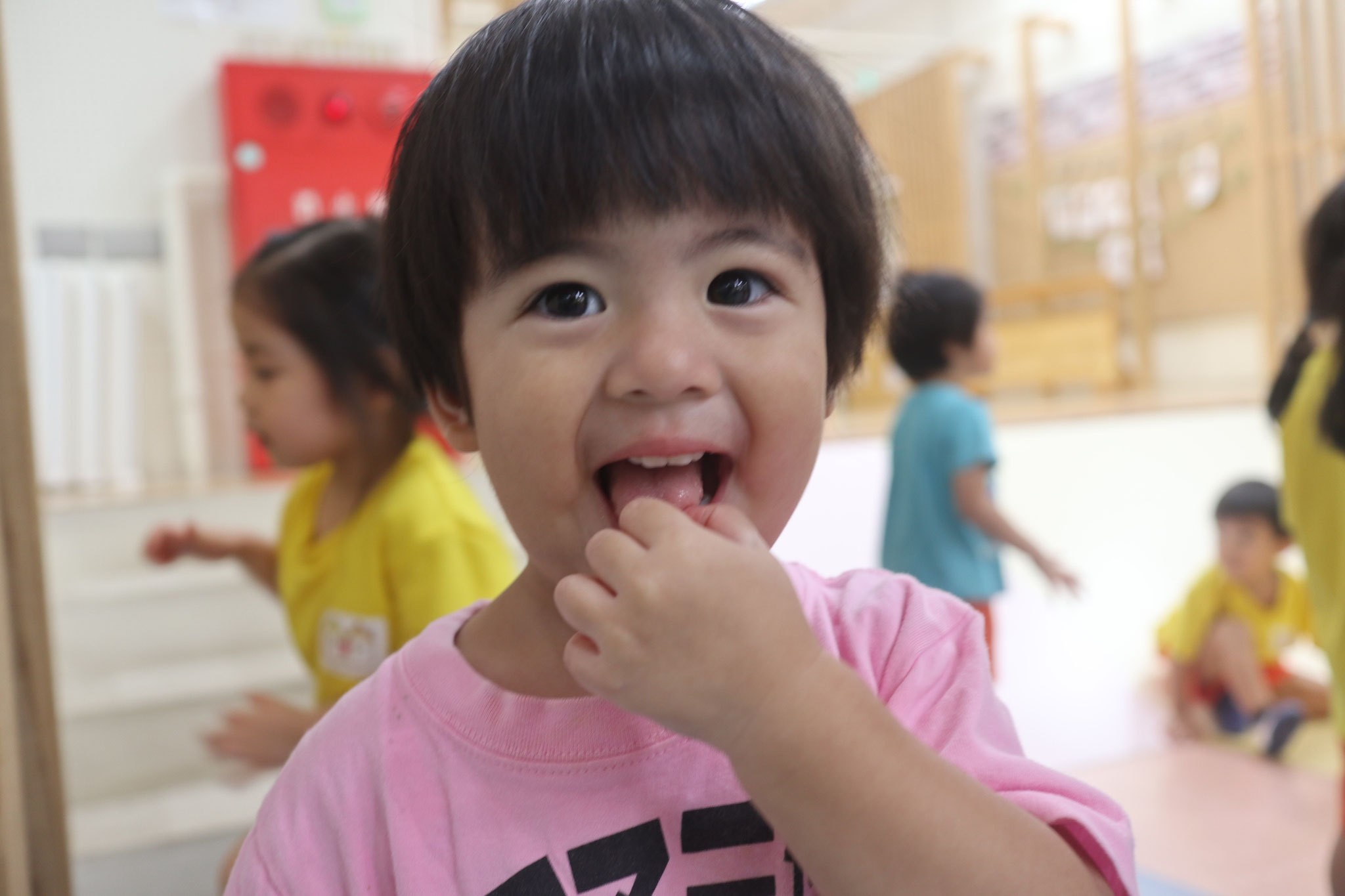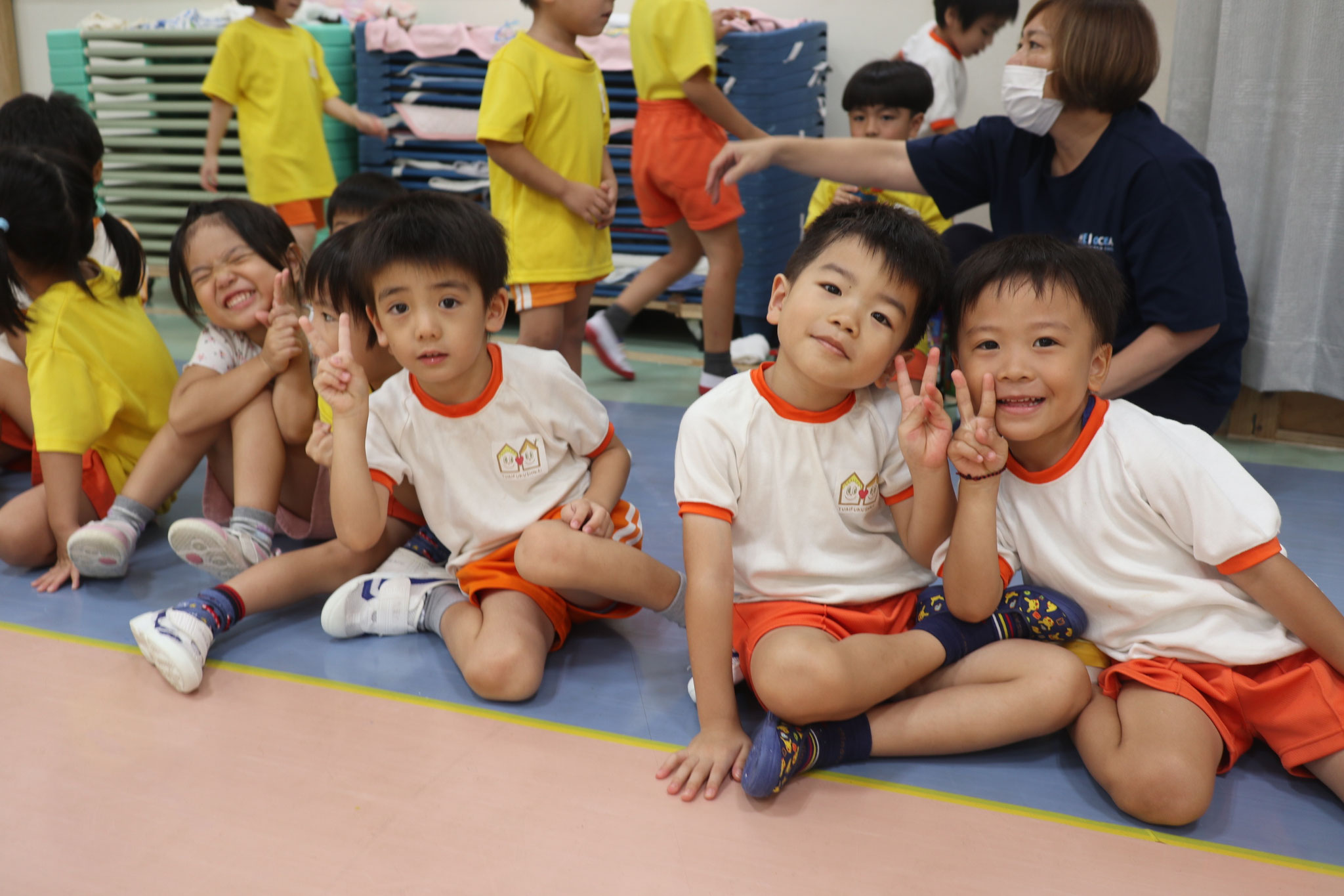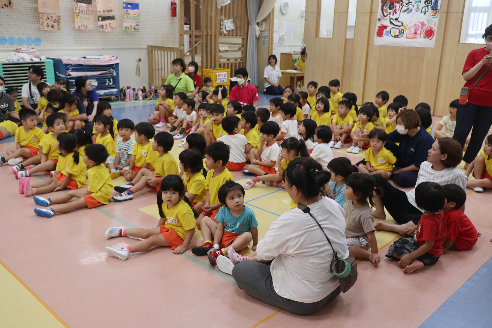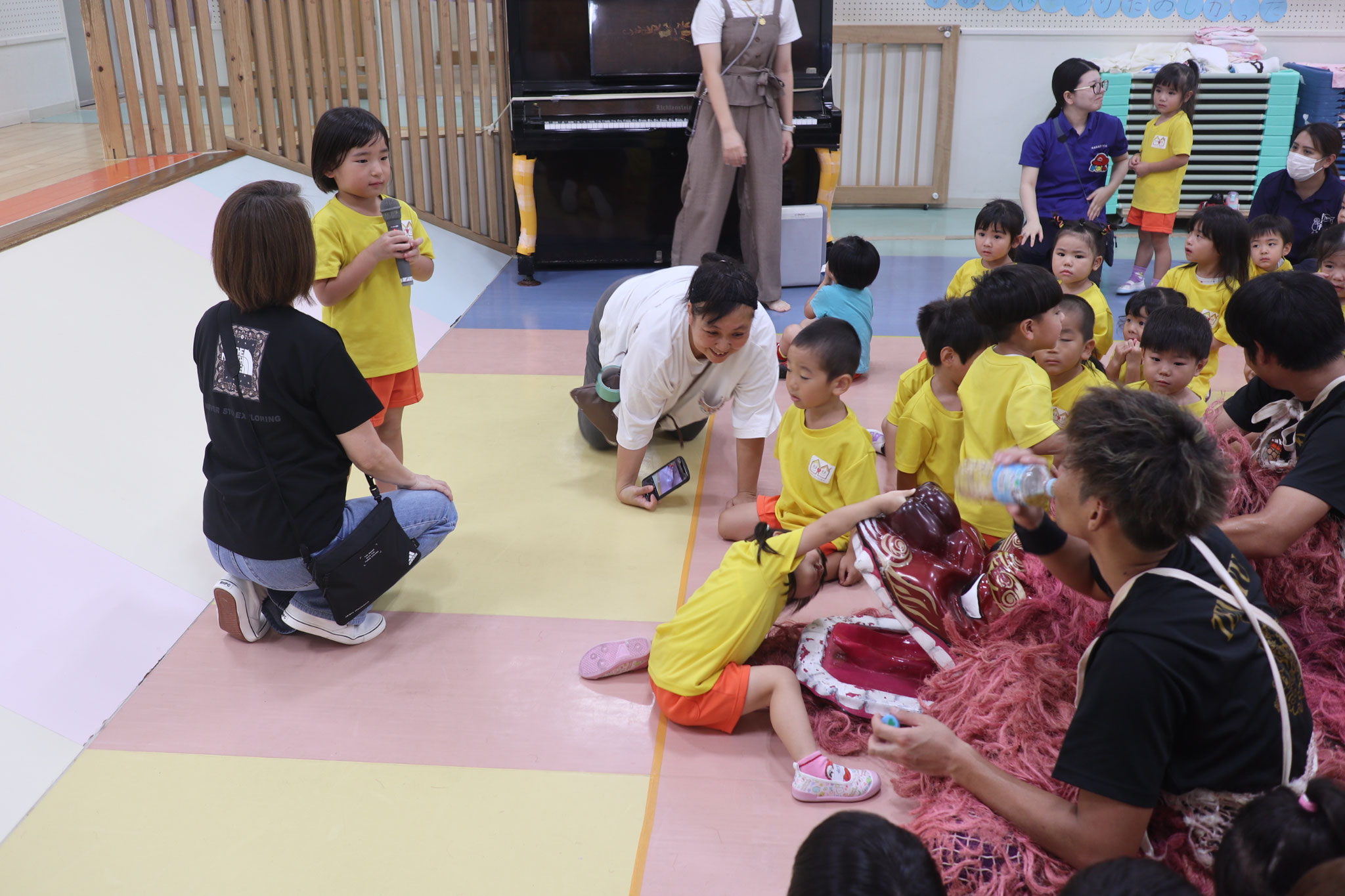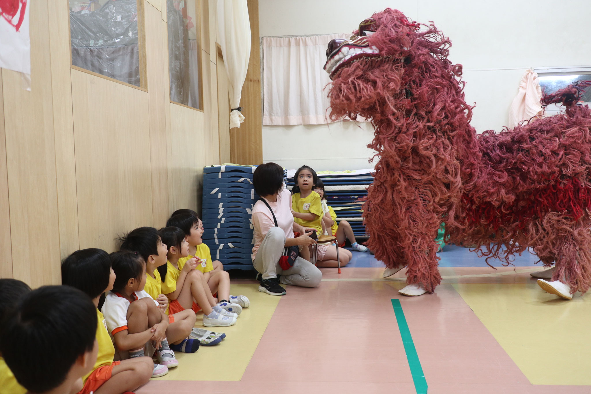 エイサーの次は、獅子舞がやってきました。それはそれは大きい獅子舞が現れると、思わず身構えてしまう子ども達もいれば、ワクワクする子ども達もいて反応は様々でした。百ぐみさんの中には、獅子舞に噛まれたいとリクエストする子もいて噛まれて満足げにしていました。