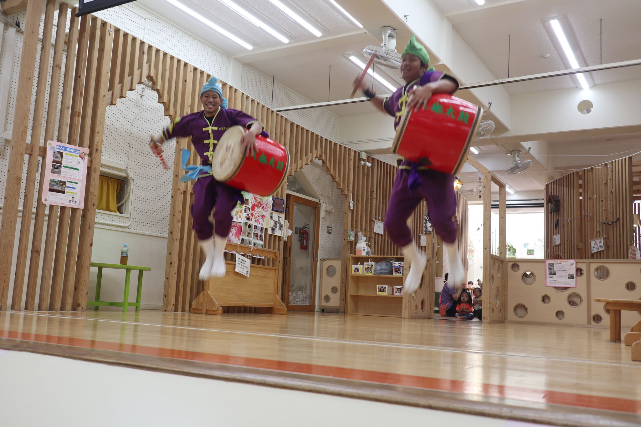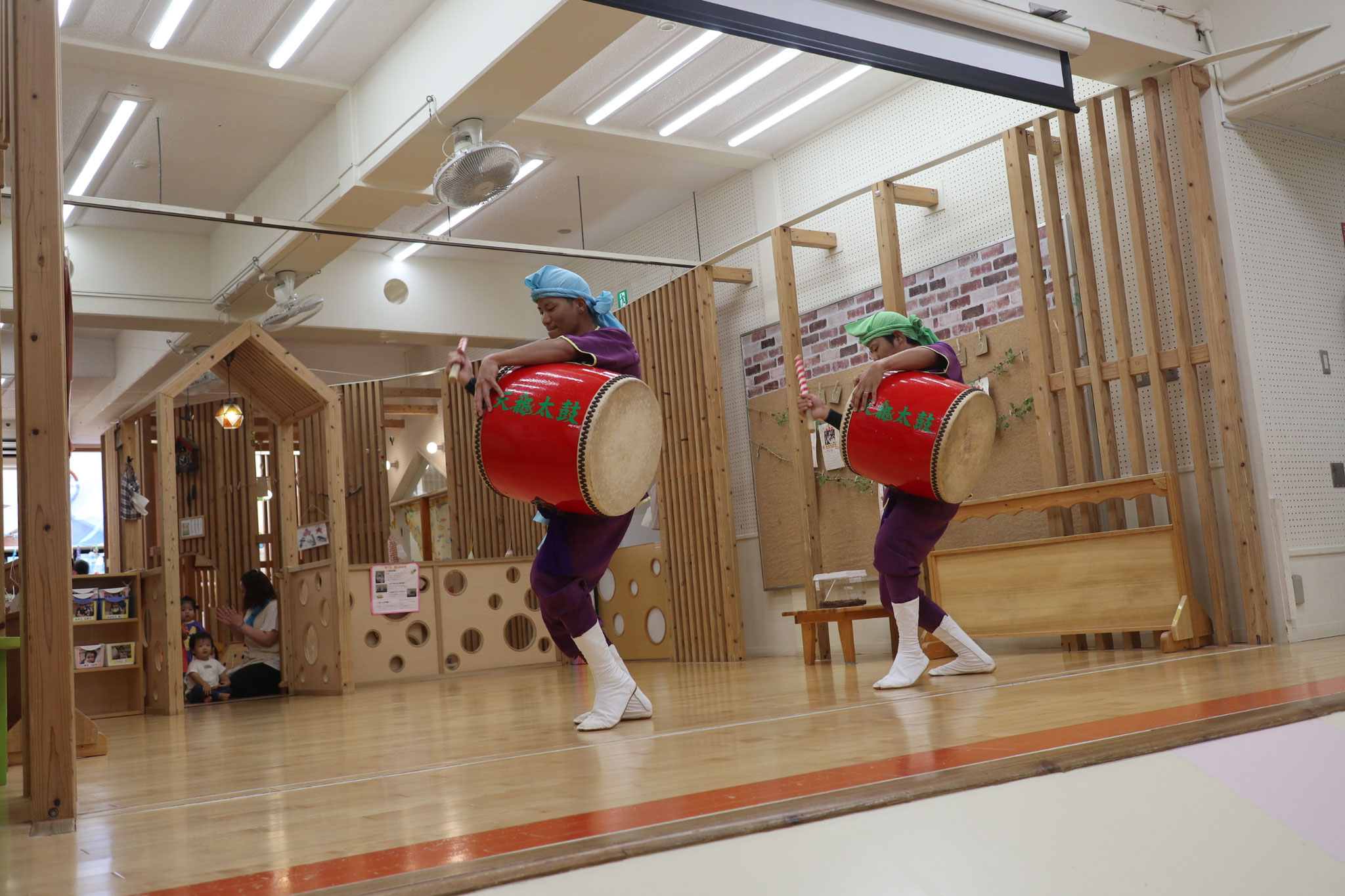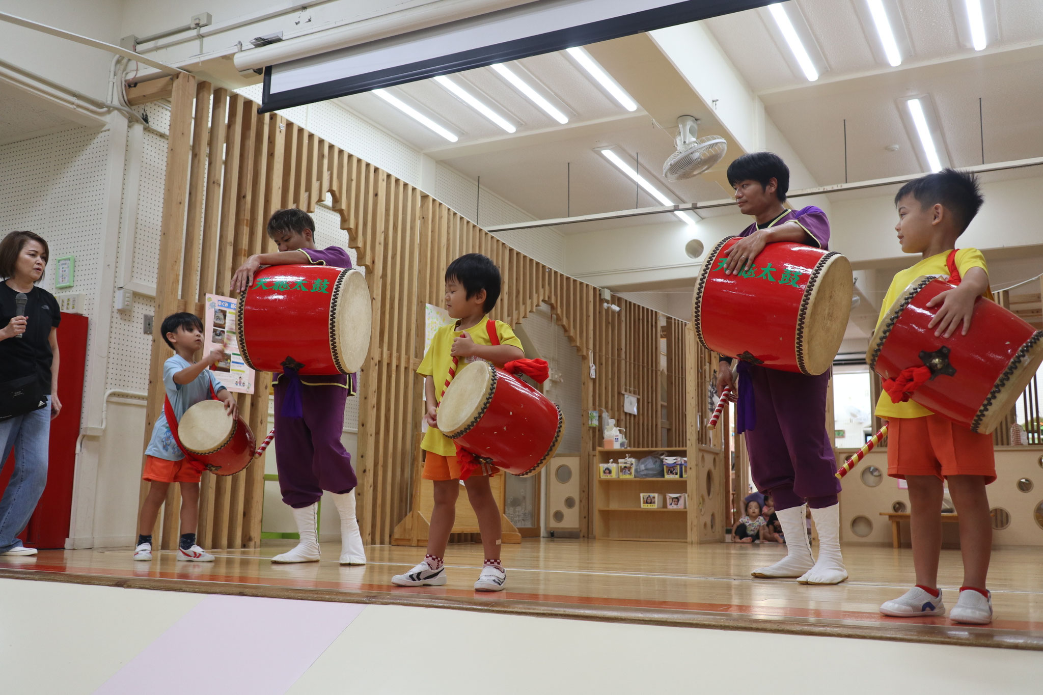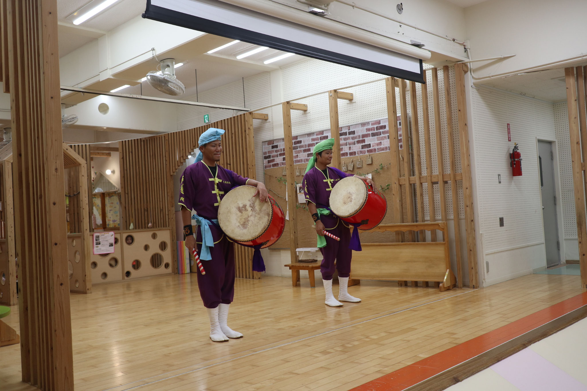 今回は、去年もお越し頂いた職員さんの旦那さんご兄弟にご協力してもらいました。エイサーは毎年、地域の大嶺まつりの中でも披露していることもあり、馴染みあるものになりますが、百ぐみさんは気付きます。「自分達の太鼓よりも大きいんじゃない?」と。音の迫力もすごくて、前で見ている子の中には耳を塞いで聞こえる音を調整していました。お兄ちゃんたちの演武もダイナミックでかっこよく、目を輝かせてみる子ども達です。大太鼓を担ぎながらジャンプする姿には驚かされました。実際に、百ぐみさんの男の子3名が自分たちの太鼓をもって隣に並んでみると、太鼓の大きさの違いに驚きです。叩かせてもらうと、音の違いにも驚きです。一緒にダイナミック琉球も踊ることが出来ました。
