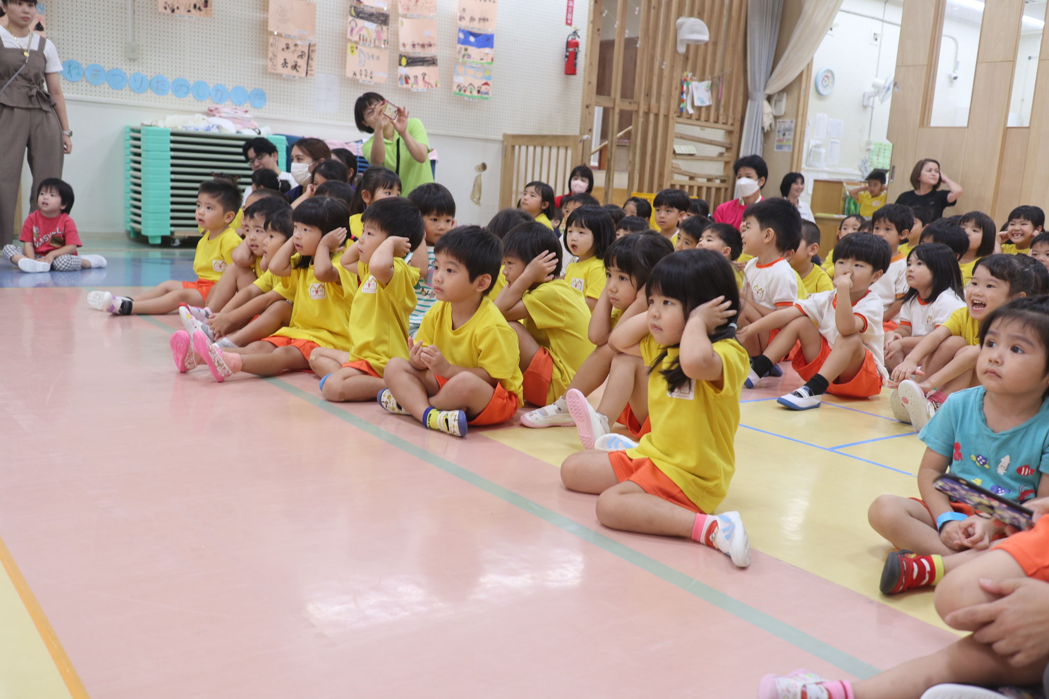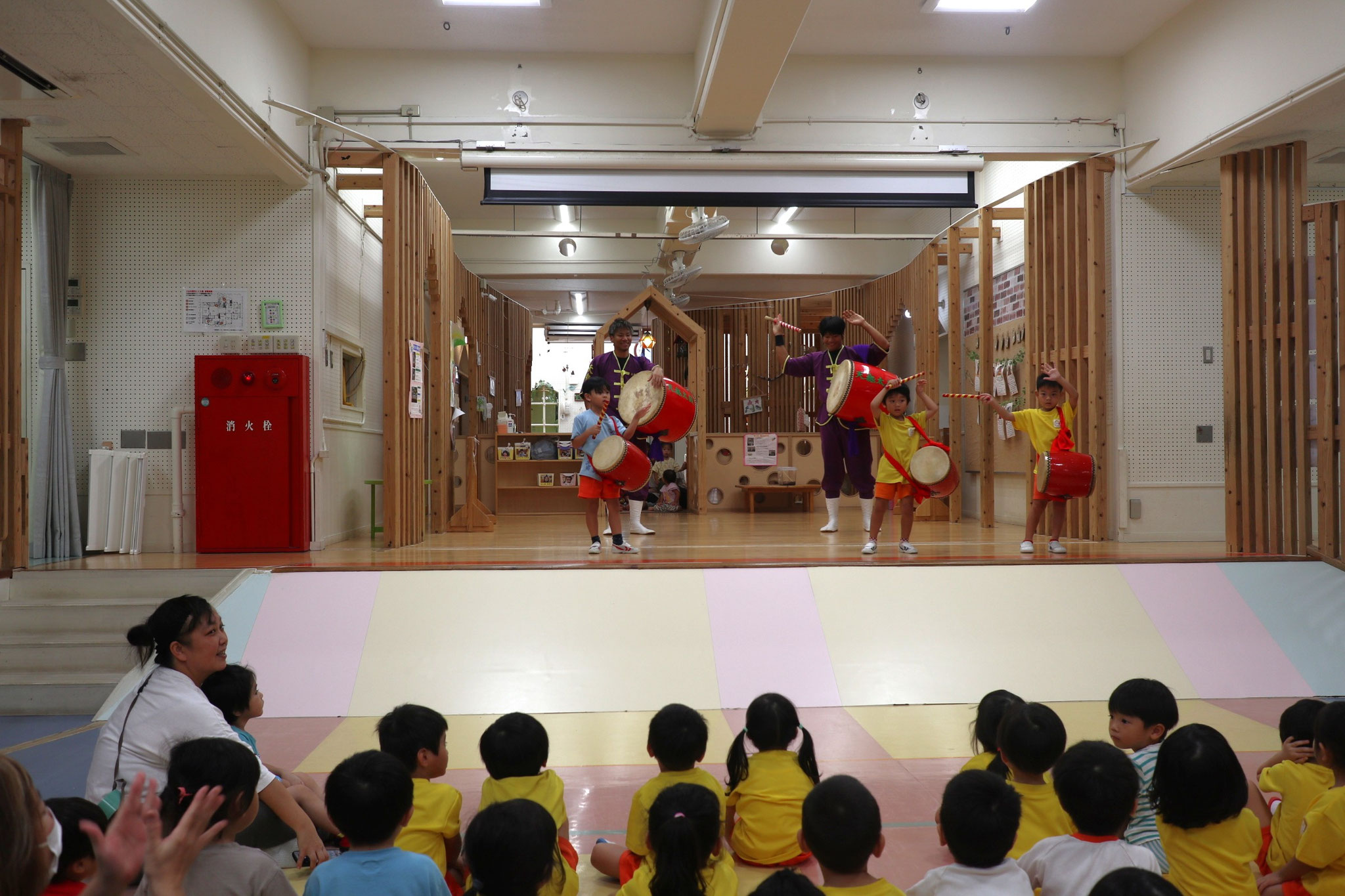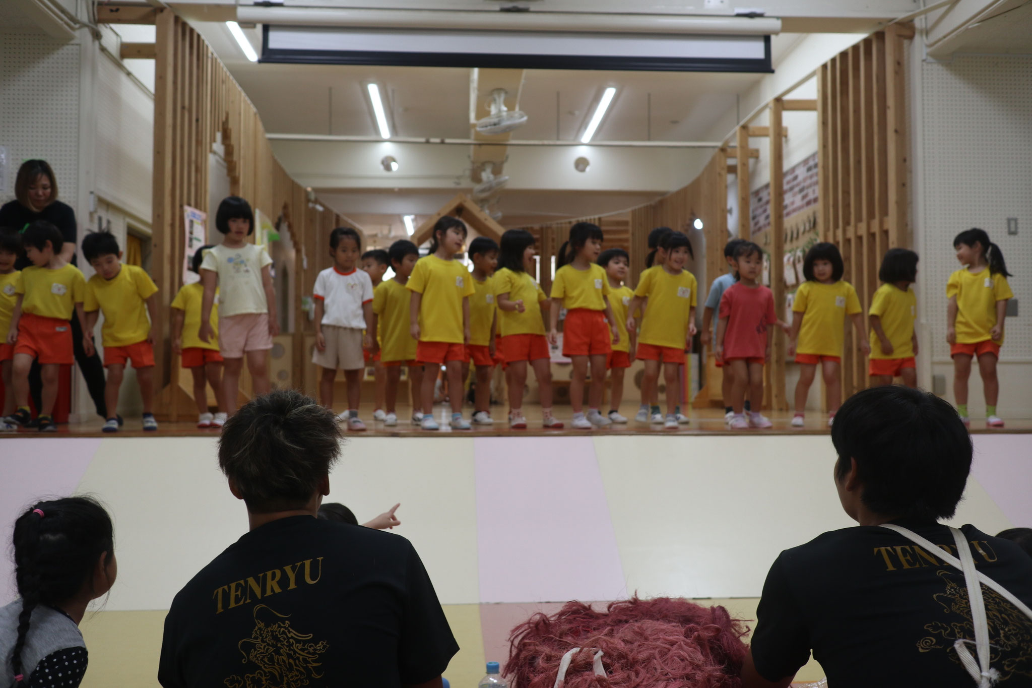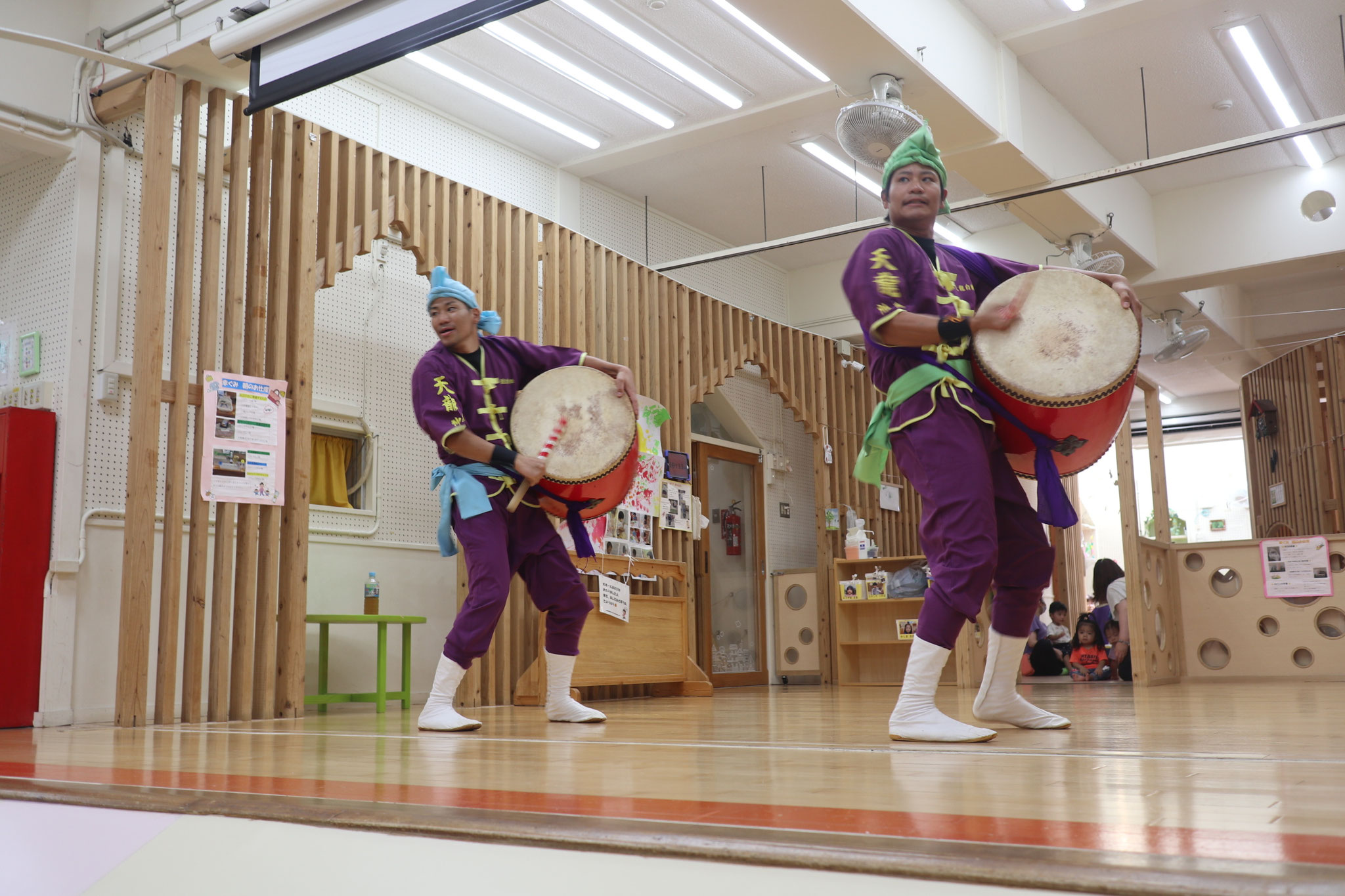 今回は、去年もお越し頂いた職員さんの旦那さんご兄弟にご協力してもらいました。エイサーは毎年、地域の大嶺まつりの中でも披露していることもあり、馴染みあるものになりますが、百ぐみさんは気付きます。「自分達の太鼓よりも大きいんじゃない?」と。音の迫力もすごくて、前で見ている子の中には耳を塞いで聞こえる音を調整していました。お兄ちゃんたちの演武もダイナミックでかっこよく、目を輝かせてみる子ども達です。大太鼓を担ぎながらジャンプする姿には驚かされました。実際に、百ぐみさんの男の子3名が自分たちの太鼓をもって隣に並んでみると、太鼓の大きさの違いに驚きです。叩かせてもらうと、音の違いにも驚きです。一緒にダイナミック琉球も踊ることが出来ました。