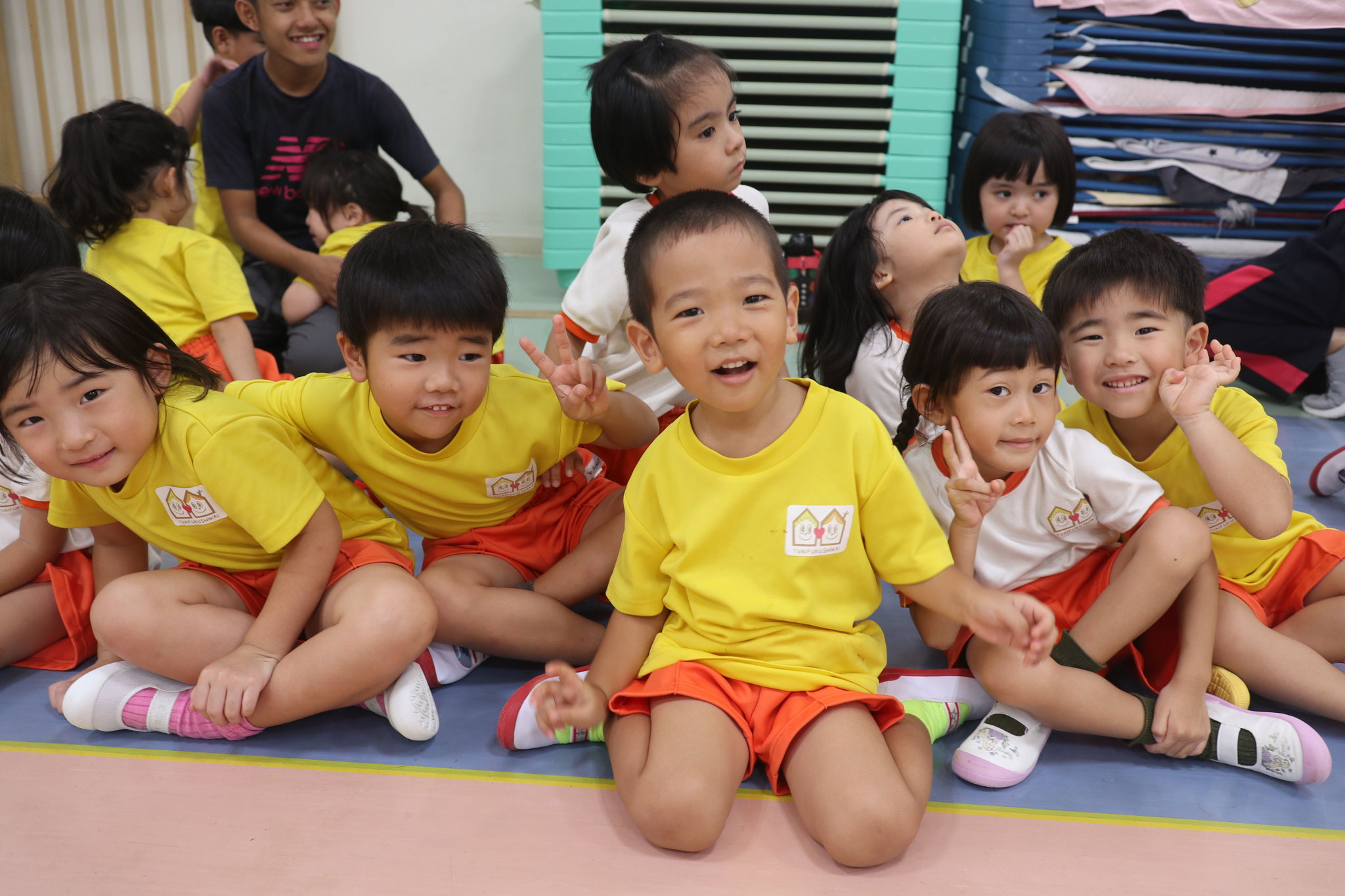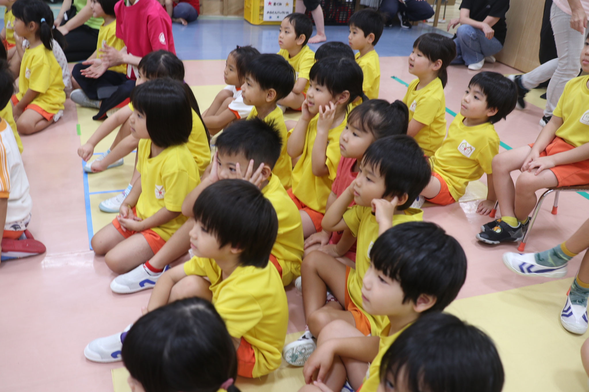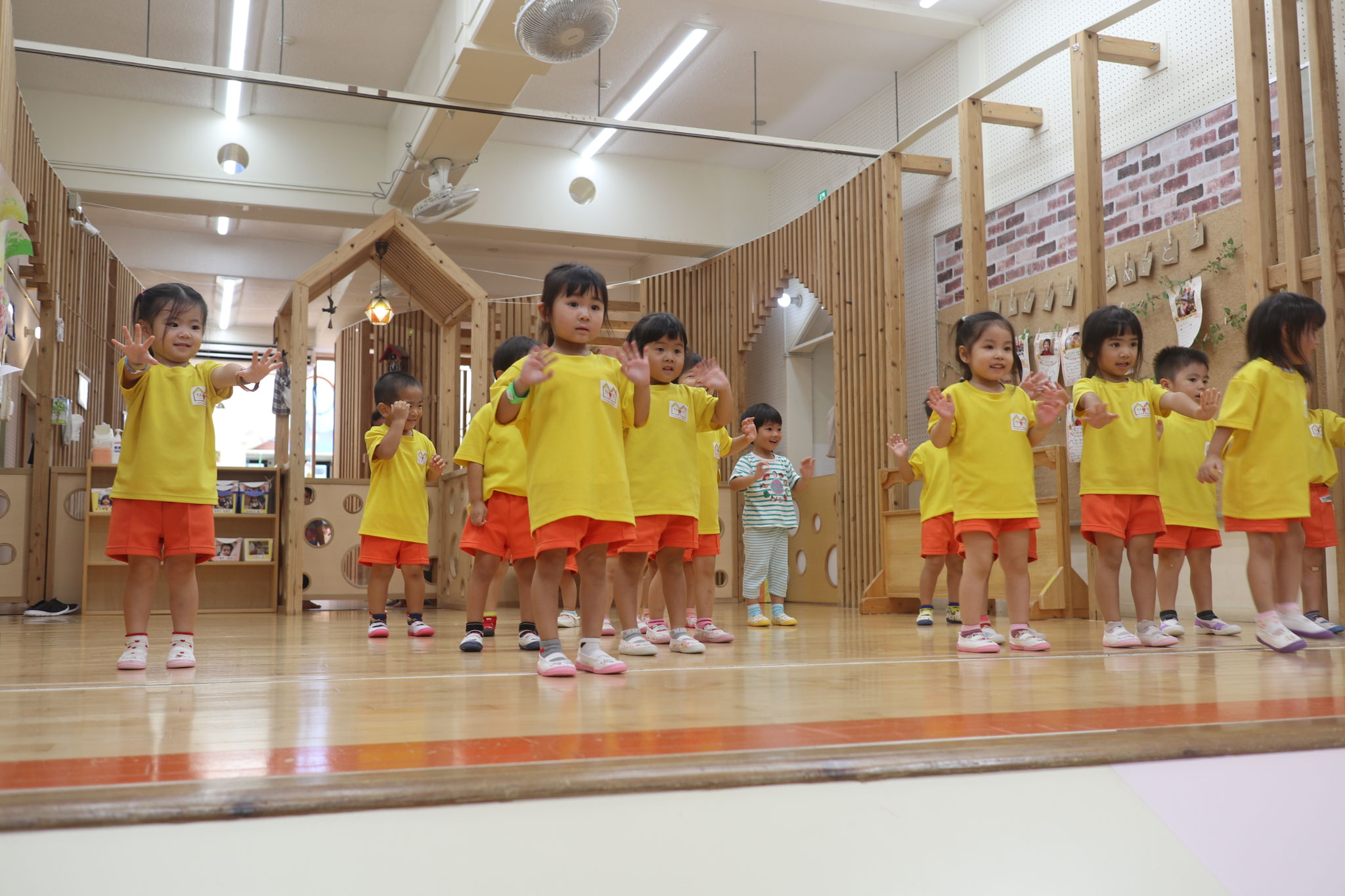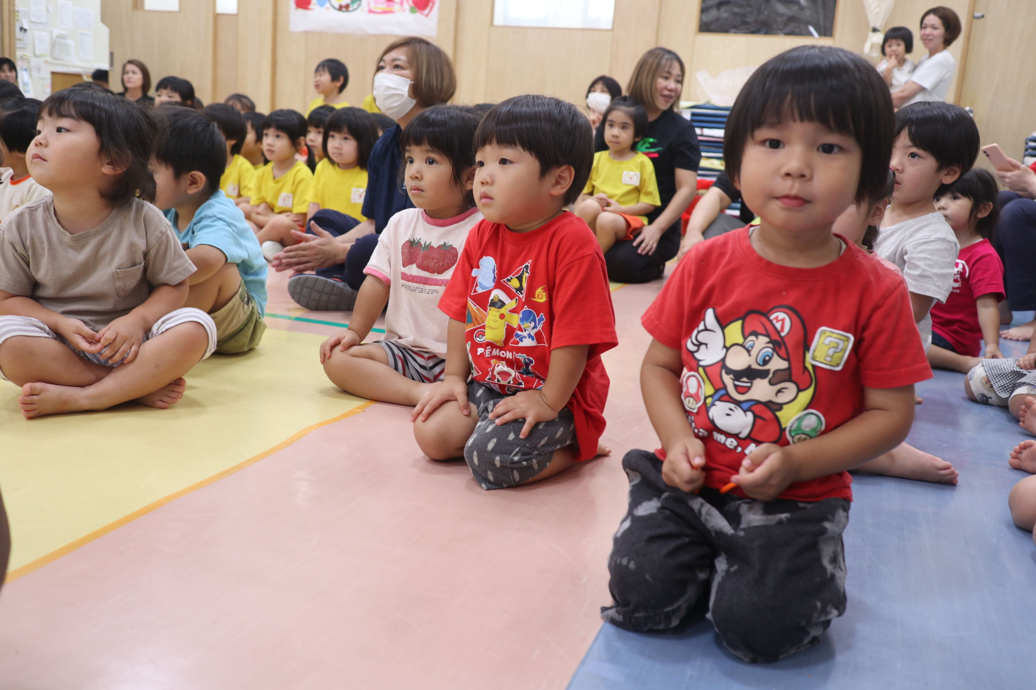 今回は、去年もお越し頂いた職員さんの旦那さんご兄弟にご協力してもらいました。エイサーは毎年、地域の大嶺まつりの中でも披露していることもあり、馴染みあるものになりますが、百ぐみさんは気付きます。「自分達の太鼓よりも大きいんじゃない?」と。音の迫力もすごくて、前で見ている子の中には耳を塞いで聞こえる音を調整していました。お兄ちゃんたちの演武もダイナミックでかっこよく、目を輝かせてみる子ども達です。大太鼓を担ぎながらジャンプする姿には驚かされました。実際に、百ぐみさんの男の子3名が自分たちの太鼓をもって隣に並んでみると、太鼓の大きさの違いに驚きです。叩かせてもらうと、音の違いにも驚きです。一緒にダイナミック琉球も踊ることが出来ました。