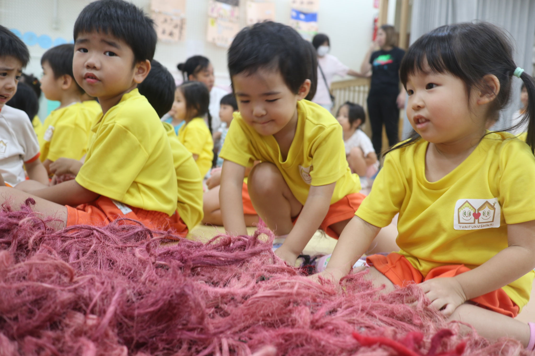 お礼に子どもたちからダンスのプレゼントもありました。大好きになったお兄ちゃん達に全力のダンスを披露して楽しんでくれた様子に喜ぶ子ども達でした。獅子舞にも触れることができて、お口の中に自ら入る子もいたり、口がパカパカ開いたりする仕組みにふしぎそうな顔を浮かべたりしていました。しt紋コーナーでは、「どうやって作ったの?」作り方を教えてもらい、自分でm作ってみたいと意欲を高めていました。